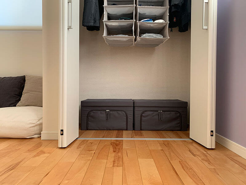 クローゼットの中央に「整理&取り出しやすい衣類収納ボックス」を2つ、取り出しやすい場所に設置。