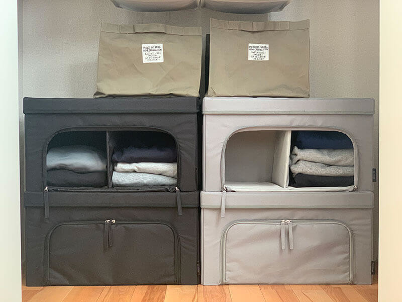衣替えの時は上から衣類をたたんで収め、取り出す時には正面のジップ開口部からスッと引っ張り出せるという、ストック管理の天才アイテムなのです。