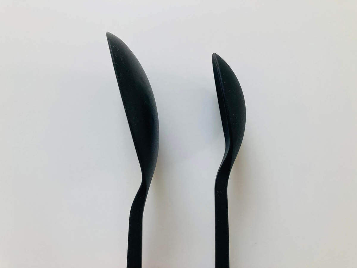 角度や深さには大きな違いはありません。素材や手触り・柔らかさも同じでした。シリコーン調理スプーンの良さはそのままに、小さいからこそ使えるサイズになっています。