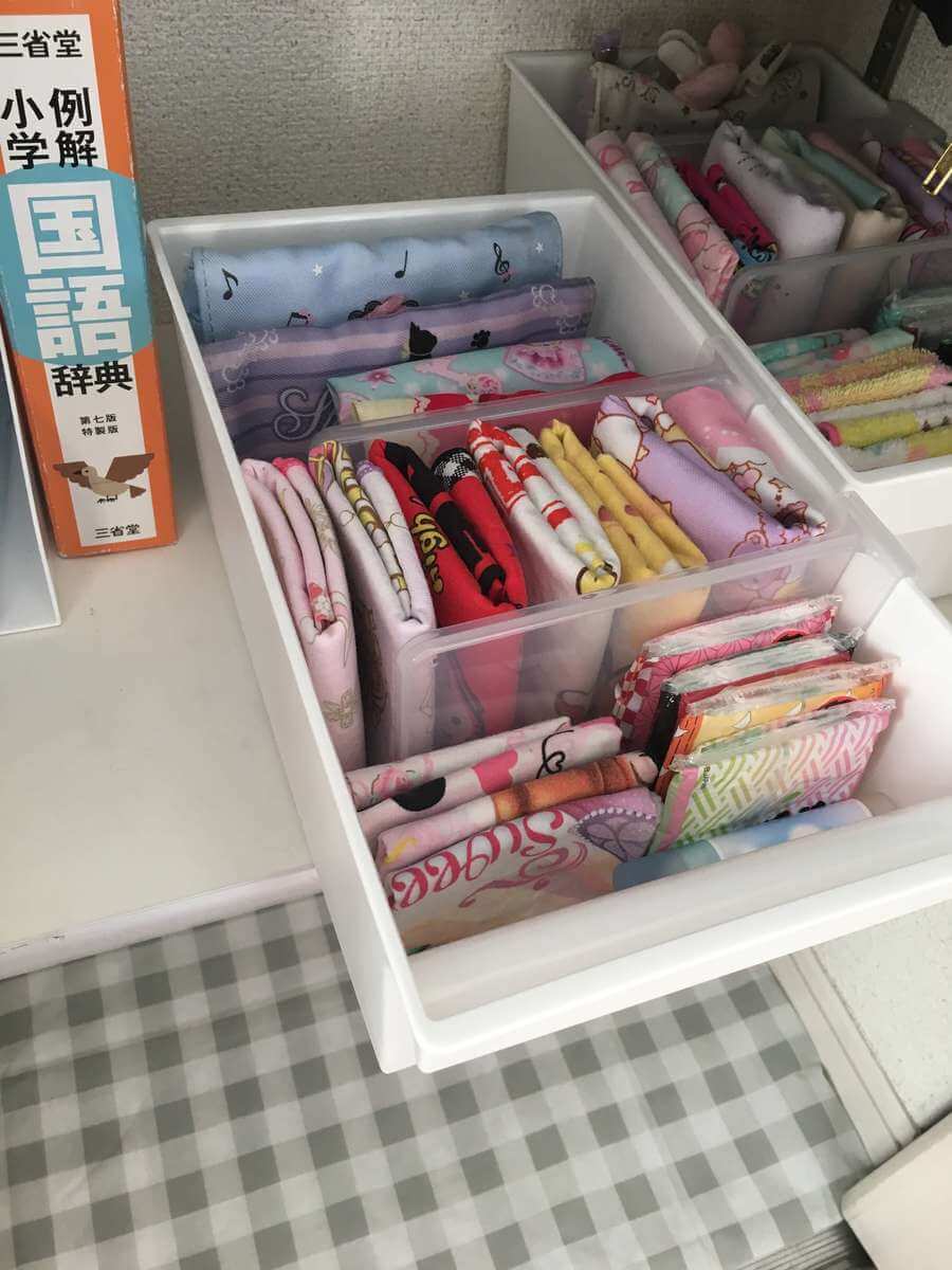 今まで毎日使うハンカチやナフキン・名札などを、無印良品の「ポリプロピレンケース・引出式・浅型」に収めていました。