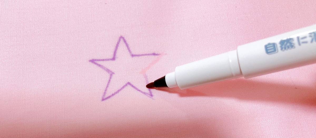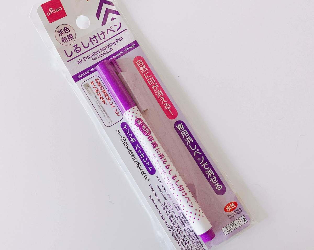ついにダイソーが大革新を起こしてくれました。それがこちら、ダイソーのクラフトコーナーで買うことのできる“しるし付けペン”100円(税抜き)です。パッケージに書かれている通り、“自然に色が消える”と言うのが最大の特徴。2日から10日経つと自然に印の跡が消えるのでもちろん洗う必要もなし!ペンの色はバイオレットなのでわかりやすいようにピンク色の布に書いてみました。