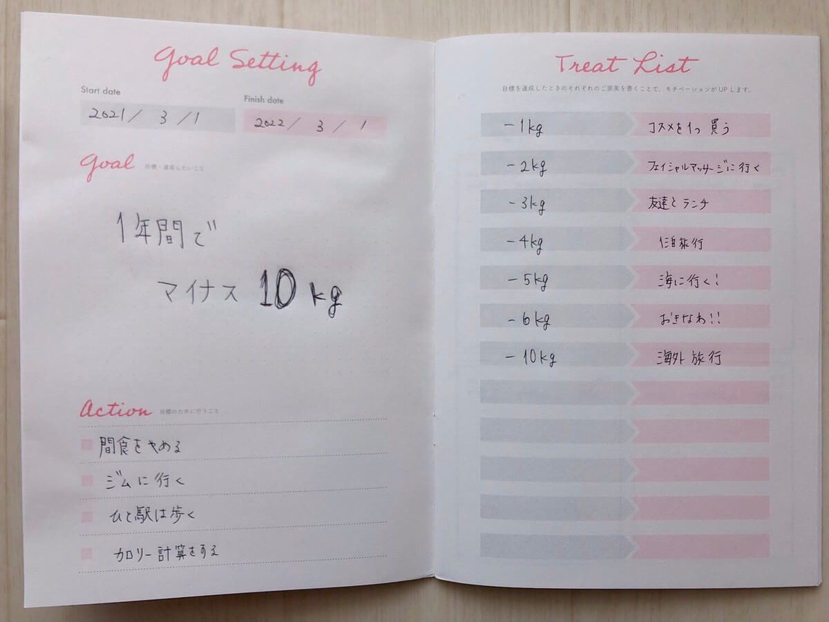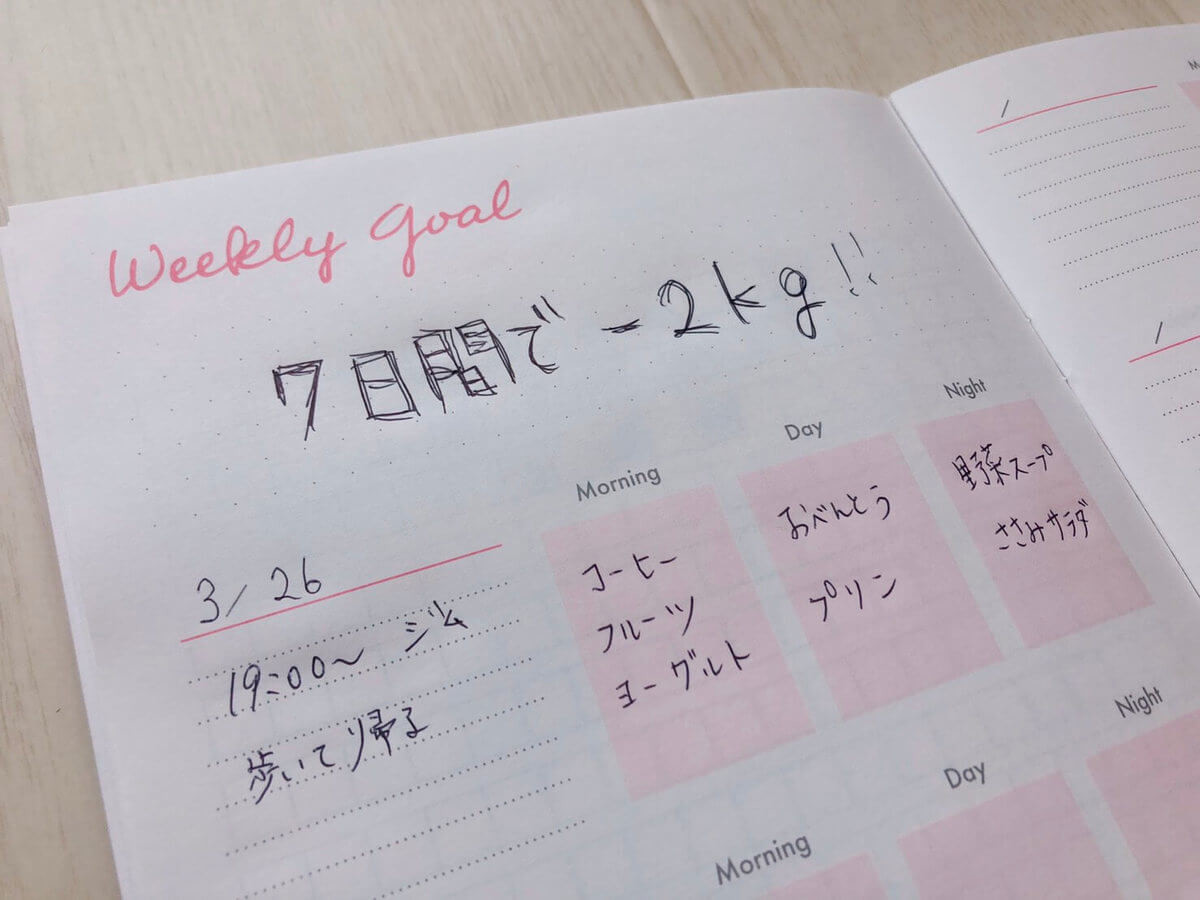 真剣に目標を決め、それを文字にして書き込むことで、より痩せたい!という気持ちが強くなり、「痩せるぞ!」と気合が入ります。