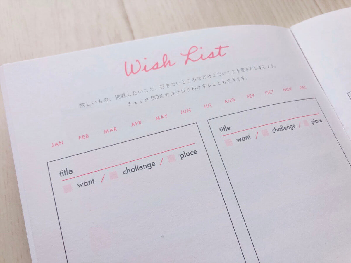 欲しいもの、行きたいところ、挑戦したいことなどやりたいことを書き出して明確にするページ。