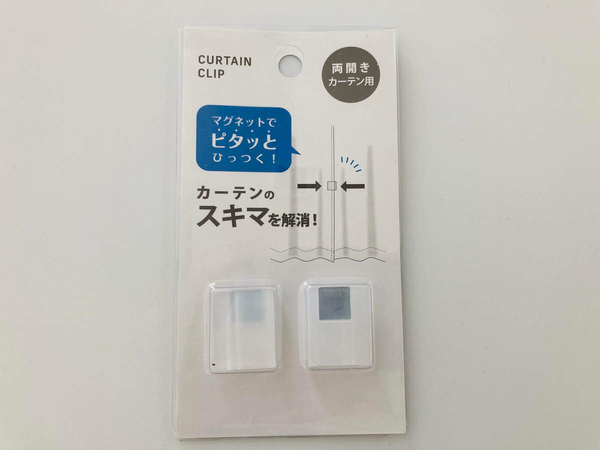 セリアの「カーテン隙間防止クリップ」。両開きカーテンの隙間をマグネットでくっつけてくれるアイデア商品です。