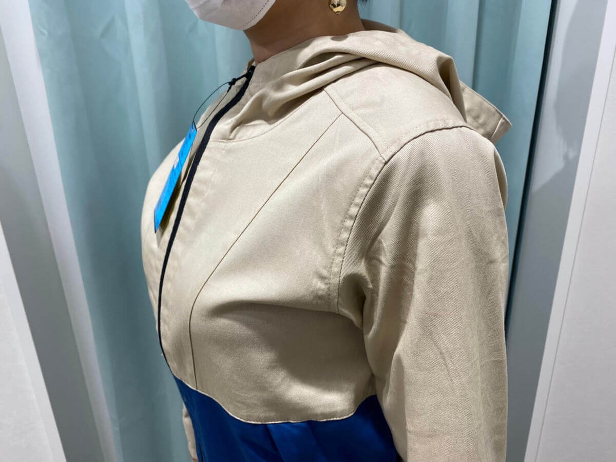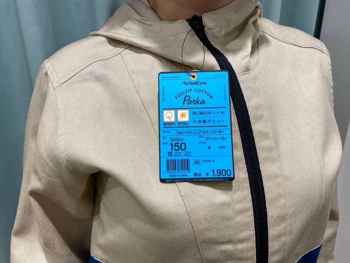まず「フルジップジュニアコットンパーカー(1,900円・税込)」を試しました。この服は、大人もキッズもともに同色が展開されています。少しかわいらしい印象になるのは、色味ではなくキッズサイズのデザインの特徴かもしれません。
