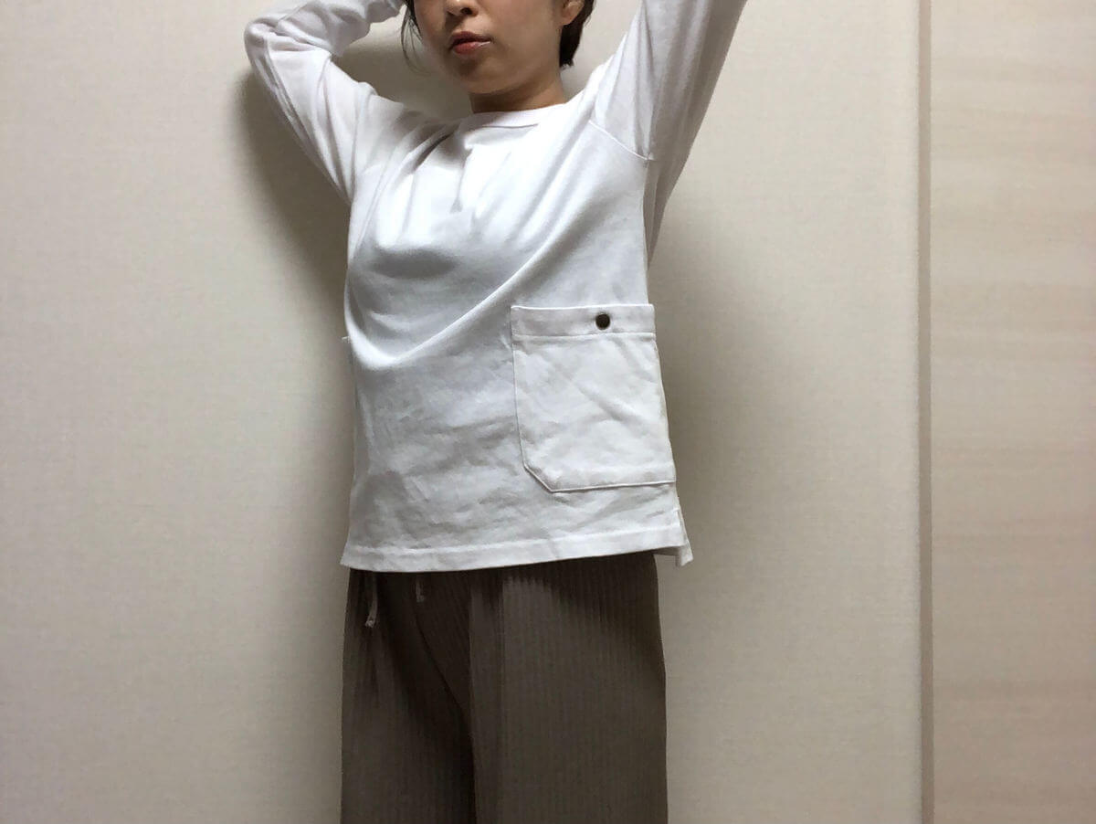 腕を通すときの窮屈さなどもなく、着用中にきつくなることもありあません。ただし腕をあげると、布が持ち上げられるので、ローライズパンツとの相性は悪そうです。ボトムスは下の写真のように、腰まで隠れるものを推奨します。