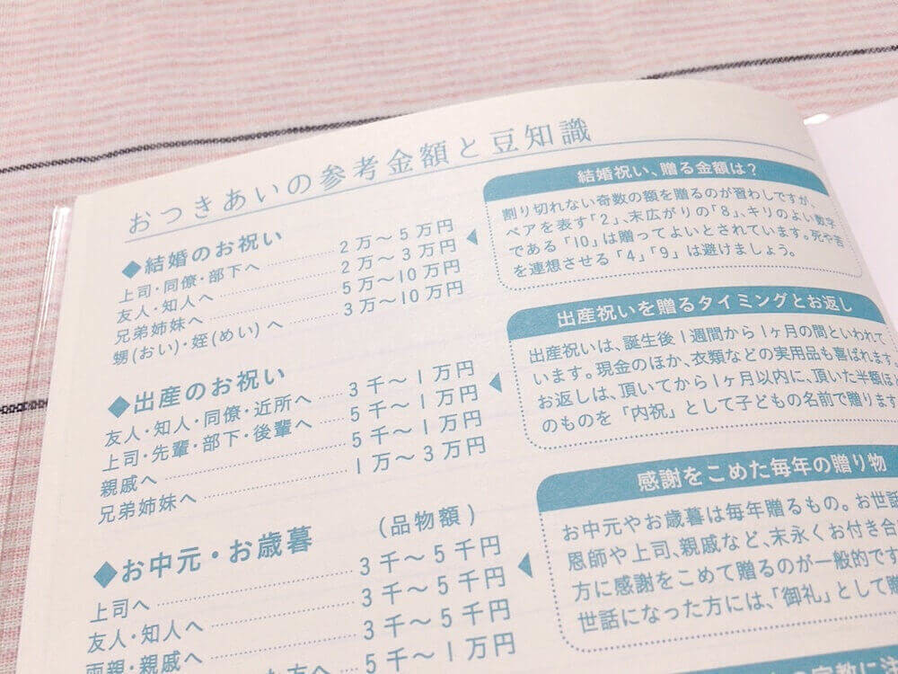 背表紙の裏には、「おつきあいの参考金額と豆知識」が載っています。スマホやPCで調べるよりも、パッと開いてすぐに見れるのがありがたいです。