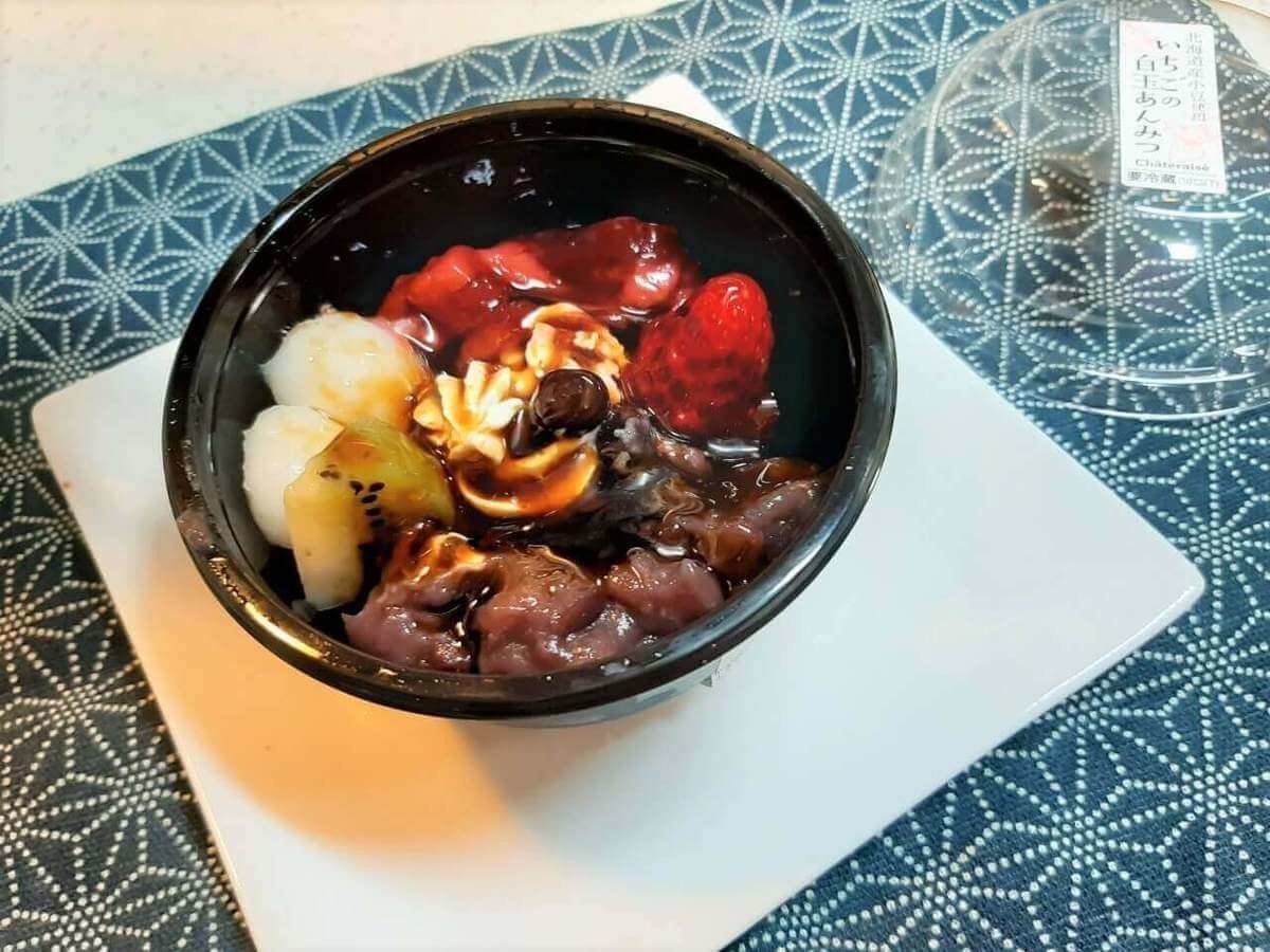 こちらの白玉あんみつは、いちご・いちごのコンポート・キウイ・ホイップクリーム・白玉・粒餡・赤えんどう豆の塩豆と具沢山なトッピング。寒天の上にトッピングをのせて黒蜜をかけていただきます。
