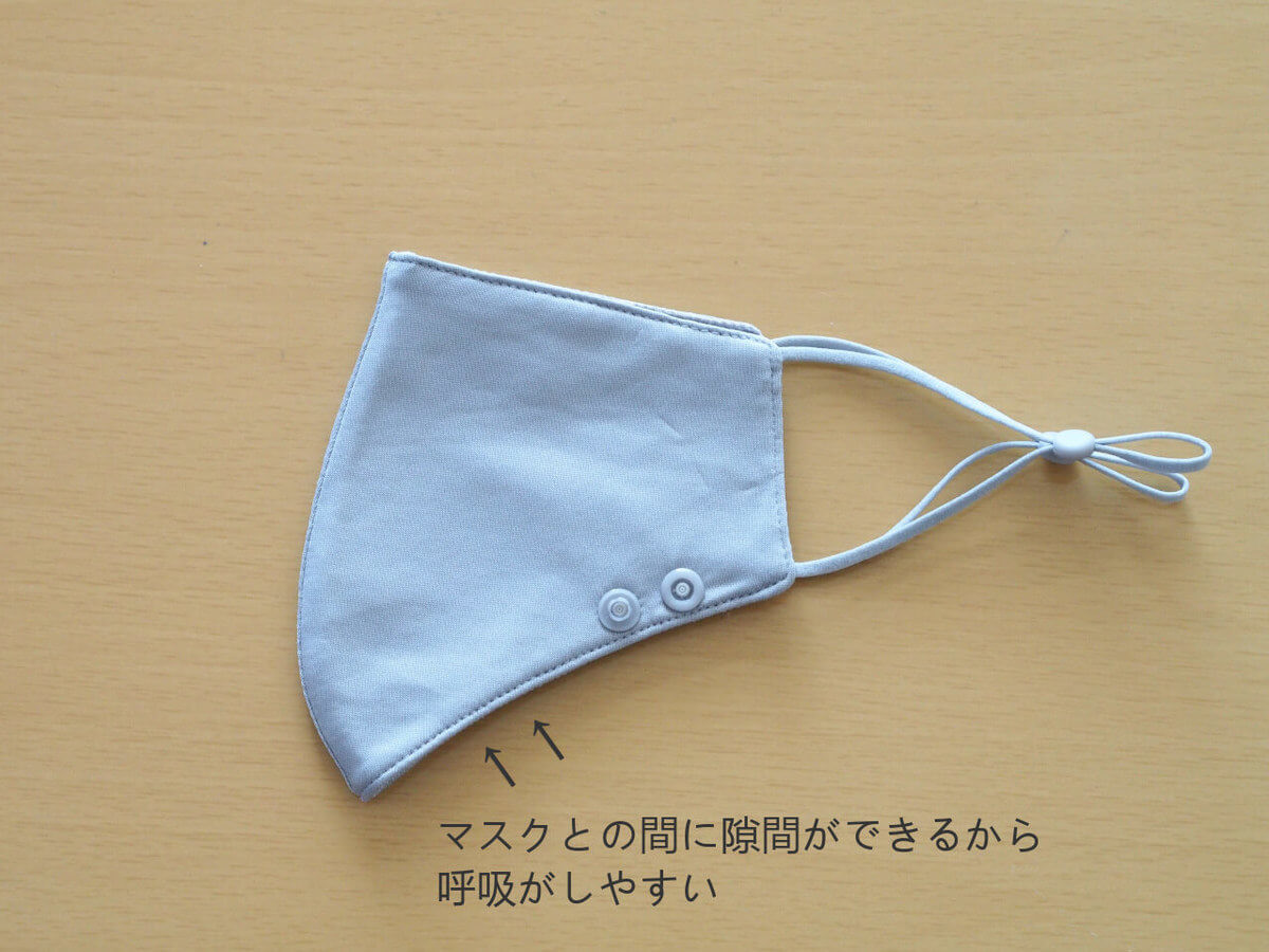 ボタンをはずしてつけた場合は、マスクと顎のあいだに隙間ができるので、呼吸がしやすくなります。