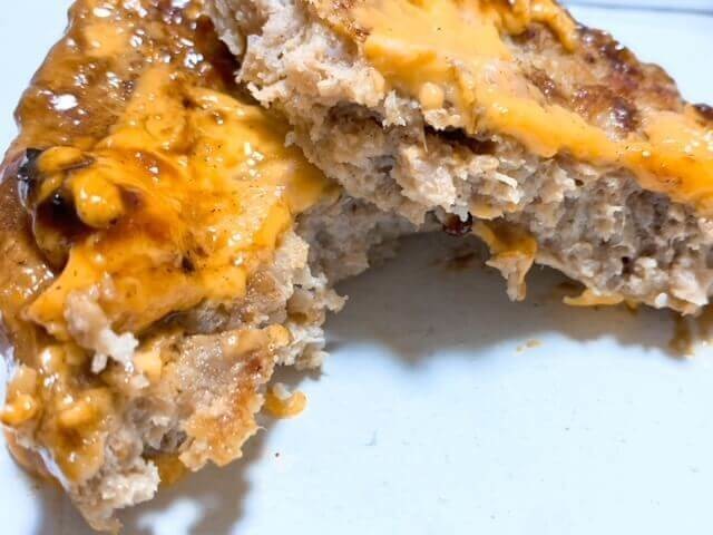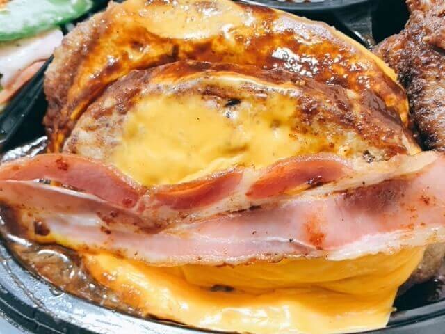 たっぷりめのデミグラスソースと大きめサイズのチーズハンバーグ。かりかりのベーコンも1枚ついてきました。