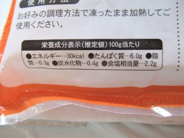 栄養成分表示(推定値)100gあたり:エネルギー30キロカロリー/たんぱく質6.0g/脂質0.3g/炭水化物0.4g/食塩相当量:2.2g