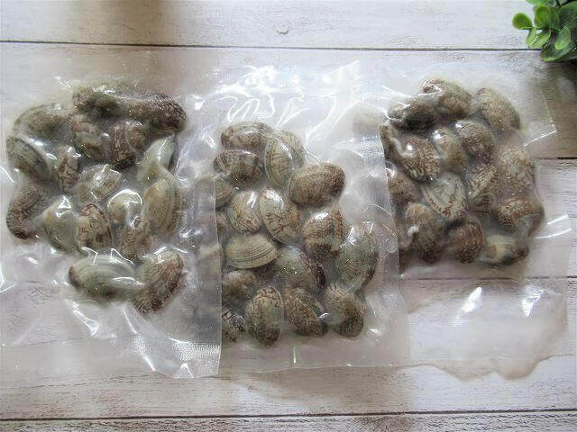 業務スーパーの殻付きあさりは、1袋150gずつが3つに分けられて真空パックされています。
