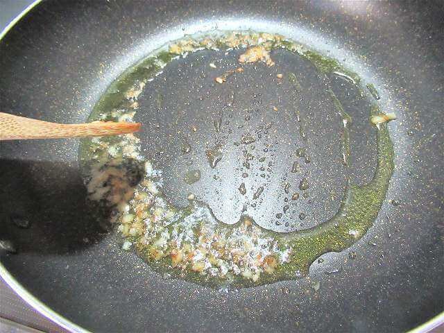 フライパンにオリーブオイルをひき、刻みにんにくを香りが出るまで炒める