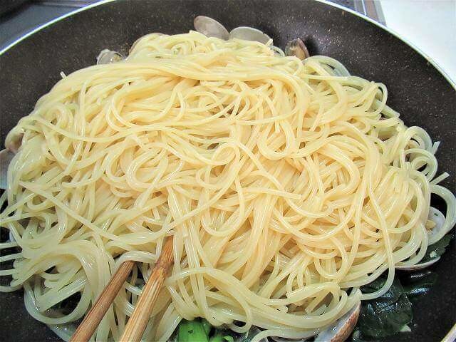 ゆであがったパスタを入れて、全体的に絡める