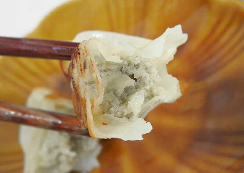 焼き目のついた餃子の皮はパリッパリ。焼きが足りない箇所は、しなっとなってしまいました。パリパリな皮がお好きであれば、気持ち長めに皮を焼いてみましょう。