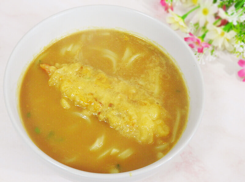 カレーのいいにおいが食欲をさそう、大きなえび天がどどーんとトッピングされたカレーうどん。