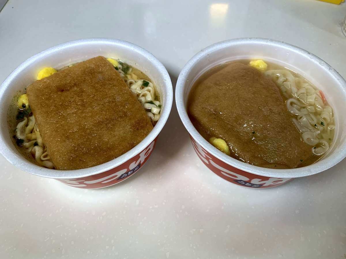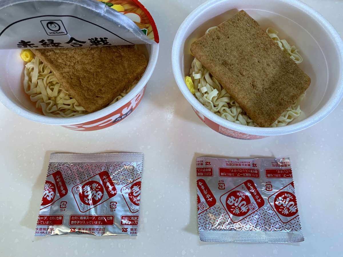 (左:そのままお湯を注いだカップうどん 右:鍋で煮たカップうどん)