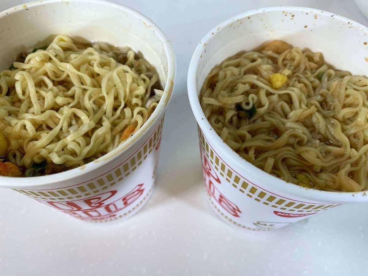 (左:そのままお湯を注いだカップラーメン 右:鍋で煮たカップラーメン)