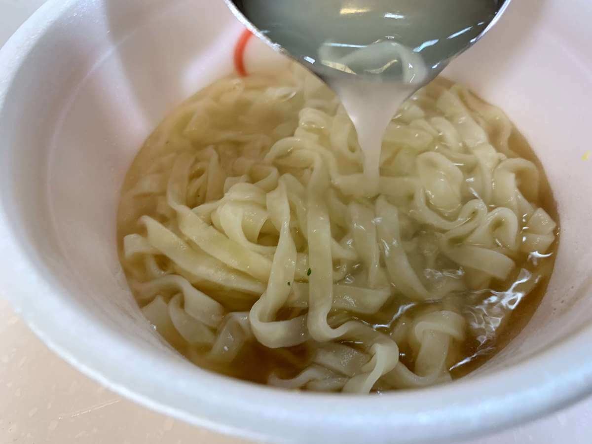 麺を食べてみると「つるん」とした食感がたまりません!確かにカップうどんとは思えない食感に仕上がっています。すごく斬新ですね。味はやさしい味でした。