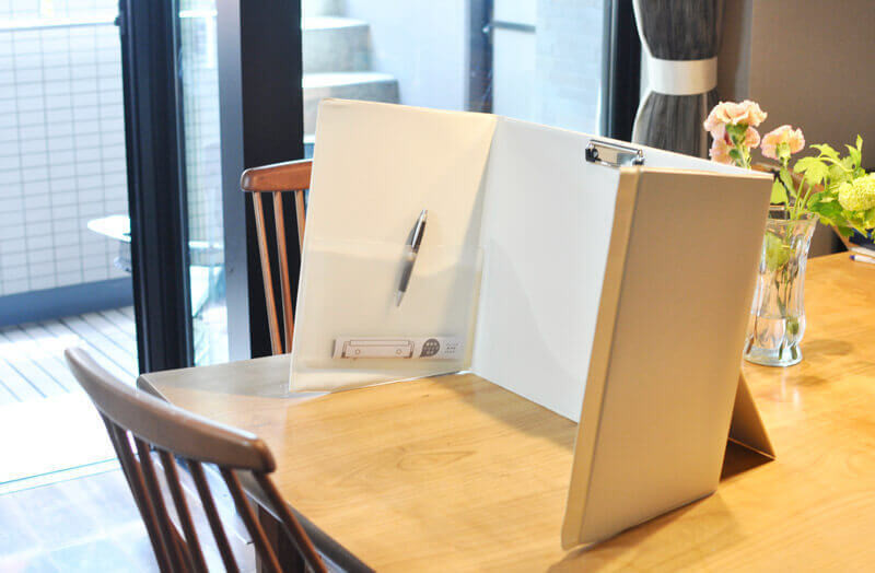 ▲分厚いものも入れているので、閉じないのはご愛嬌。このままテーブル横の棚に移動します