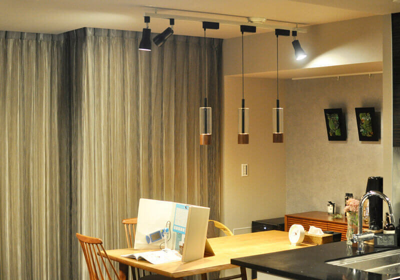 卓上ライトも検討中ではありますが、ダイニングテーブルに置くものはなるべく少なくしたいので、スポットライトを増やして光量を増強。ダイニングテーブル真上のスポットライトからの光が遮られることなく手元まで照らしてくれます。