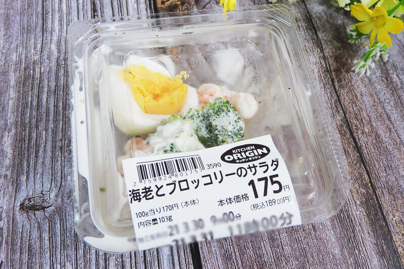 私が購入した「海老とブロッコリーのサラダ」の内容量は103g。ひとりで食べるにはちょうどいい分量ですね。店舗によって事情は異なると思いますが、比較的分量少なめのパックばかりでした。