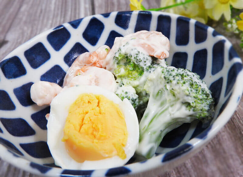 サラダには、海老とゆでたまご、ブロッコリーが入っています。全体的にマヨネーズがかかっていますが、酸味は弱めですので、具材の味をかき消すようなことはありません。
