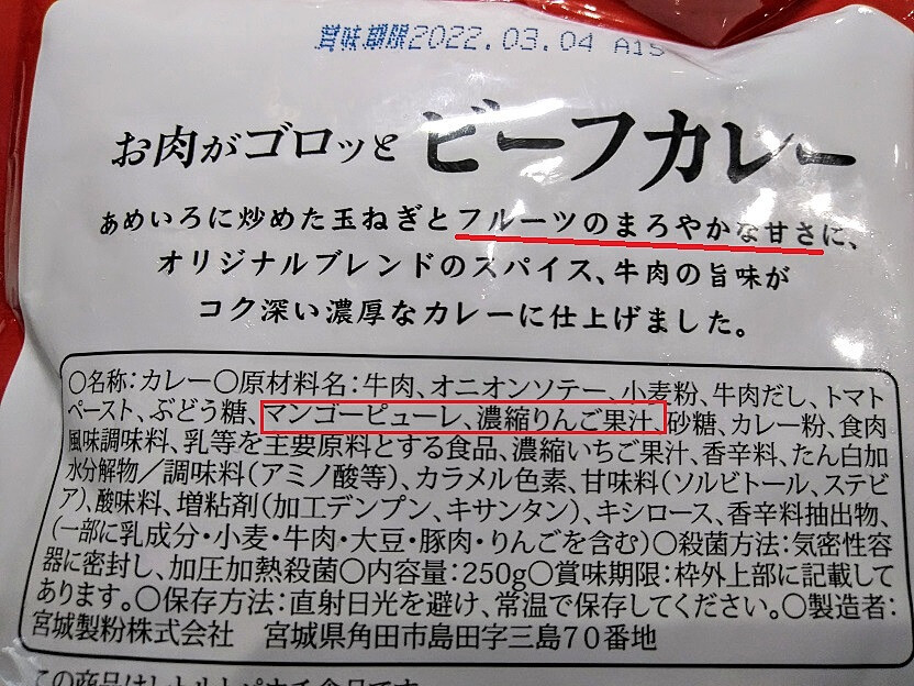 製造元は「宮城製粉株式会社」です。宮城製粉株式会社は、業務スーパー運営元「神戸物産」のグループ会社(※1)。宮城製粉株式会社の食品も業務スーパー店内でよくみかけますね。レトルトカレーはもちろんのこと、パスタソースや冷凍野菜ペーストなど結構幅広く展開されています(※2)。