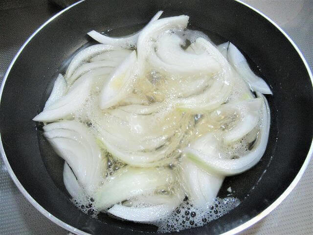 (1)フライパンにスライスした玉ねぎと水、めんつゆを入れて煮る