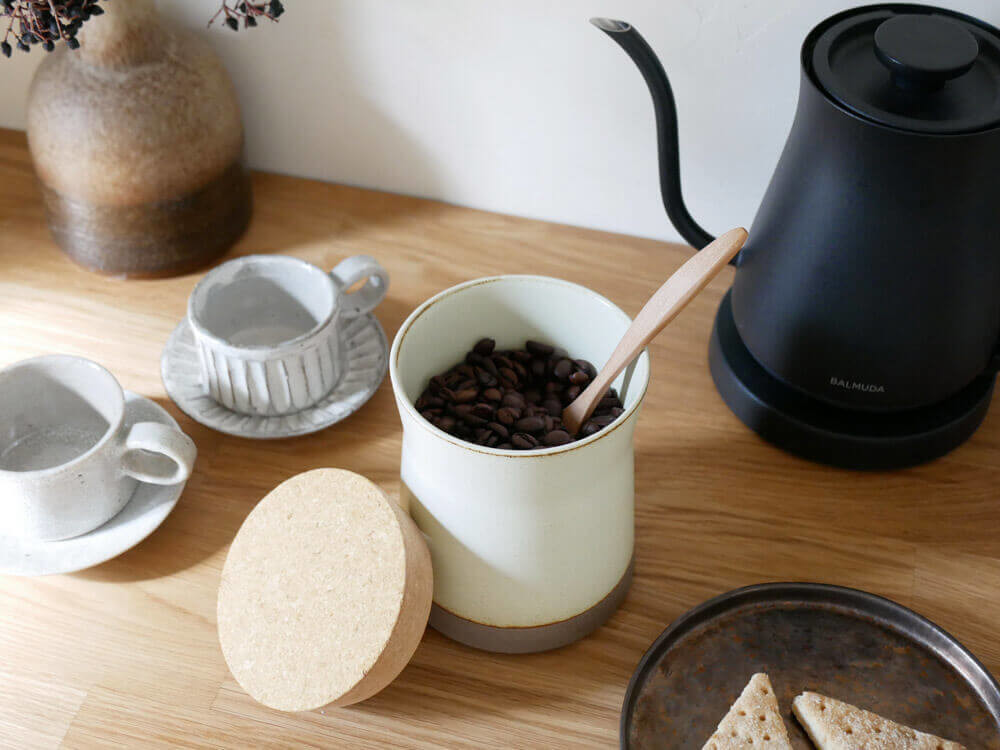磁器製の入れ物に入ったコーヒー豆や茶葉はなんだか高級感があり、特別なひと時を味わえそうですね。 また、コーヒー豆にとって紫外線は大敵なので、遮光性のある磁器製はこだわりのある方にもオススメ。