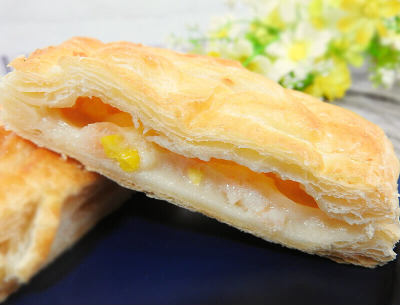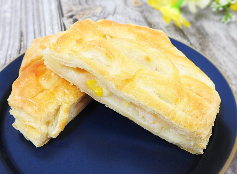 サックサクのパイ生地の中には、エビやマカロニ、コーン。そして、口あたりなめらかなグラタンが口の中でとろけて幸せな気分に……!