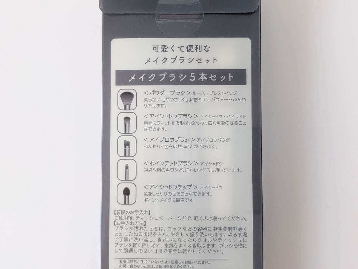 パウダーブラシ、アイシャドウブラシ、アイブロウブラシ、ポインテッドブラシ、アイシャドウチップの5本入り。 メイクには欠かせないアイテムですので、一度に全部揃えられるのは嬉しいです。