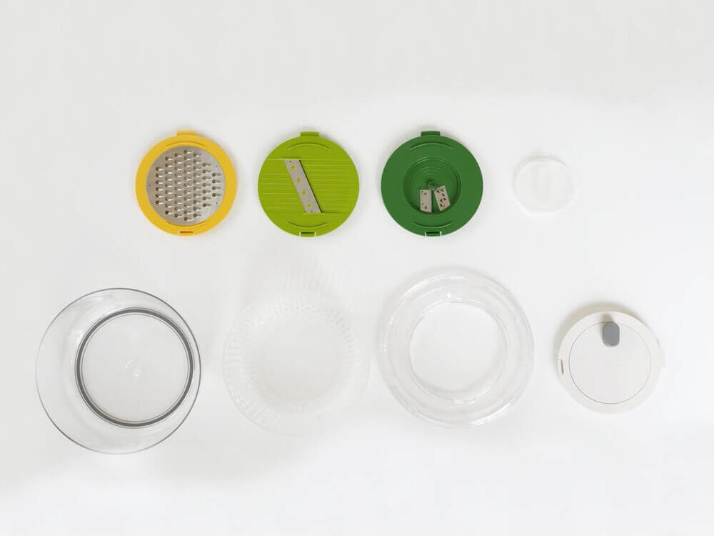 1つでサラダスピナー、ベジヌードルカッター、スライサー、グレーターの4つの使い方ができ、カラフルな色合いでコンパクトにも収納できる楽しく便利なキッチンツールのご紹介です。