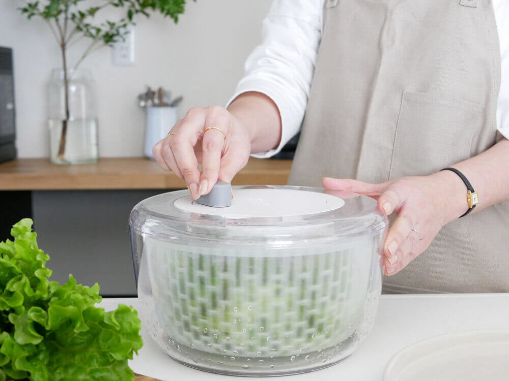 指先でくるくる回せば、バスケットが回転しその遠心力で水気を飛ばしてくれます。