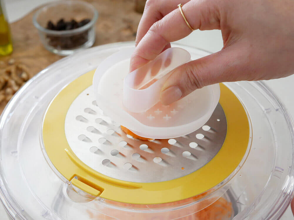 しっかりと大きさがある本体なので、手でおさえながらスムーズにすりおろしが可能。そのままボウルに落ちるので調理台などが汚れることもないのも嬉しいですね。