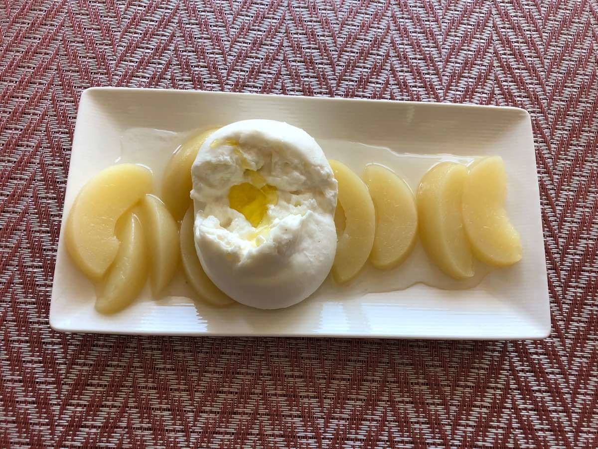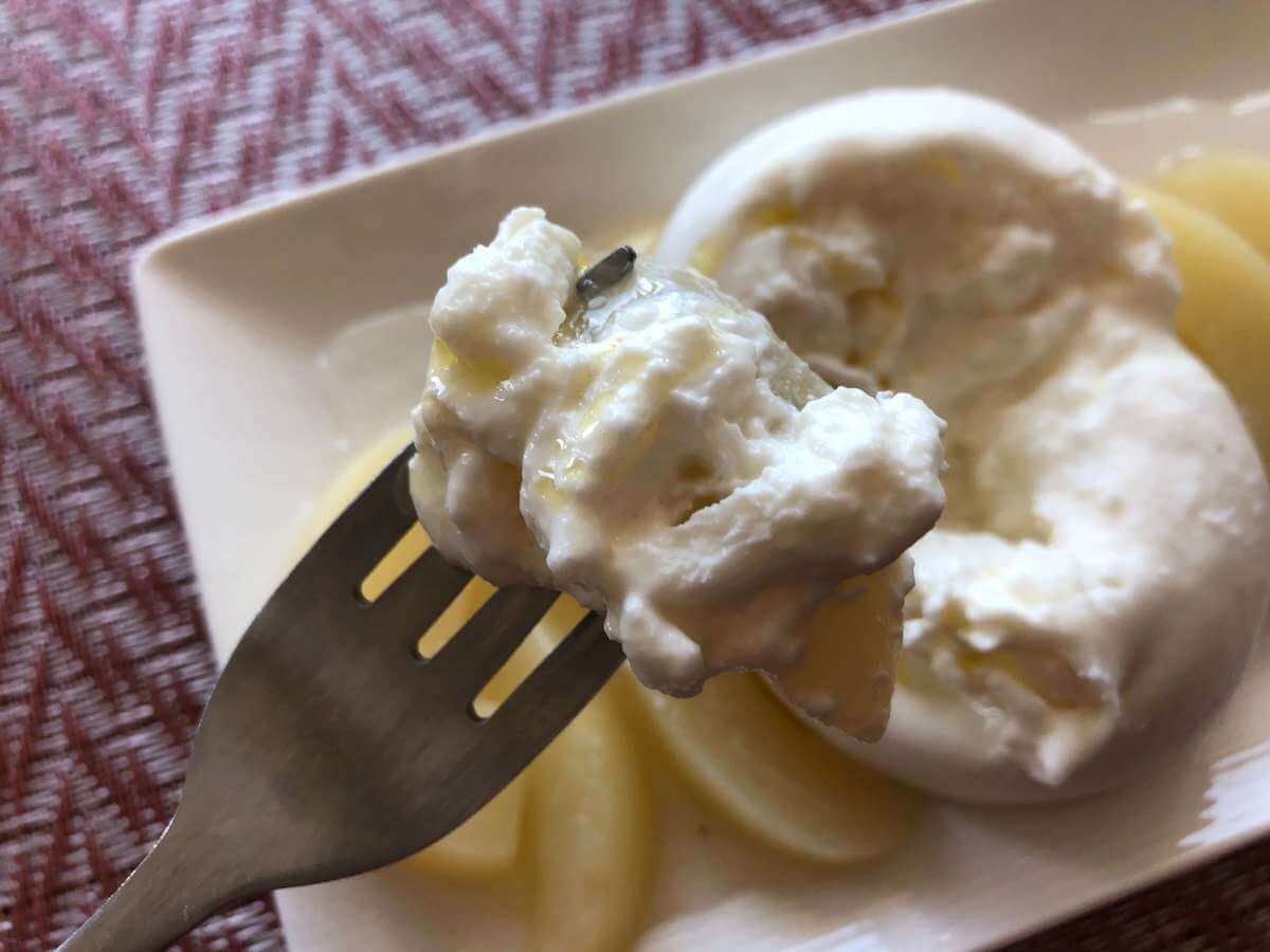 味がないというのが正しいような?桃の味は甘くておいしいのですが、ブッラータ自体は塩味もありません。それなのに、歯ごたえがもちもちっとあって、なんとも不思議な味わいです。