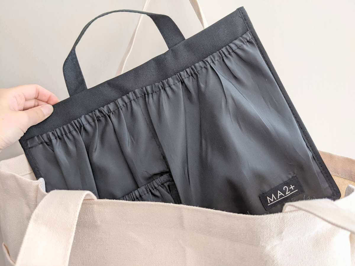 持ち手が付いているため、バッグを変えるときもそのまま持ち運べます。 バッグインバッグには芯が入っているので、バッグの仕切りにもなってくれますよ。