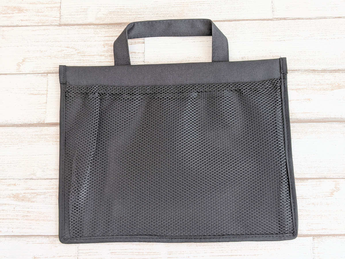 裏側は大きなメッシュポケットが付いています。 中身が一目でわかるため、〝あれ、どこいったっけ?〟なんてこともありません。