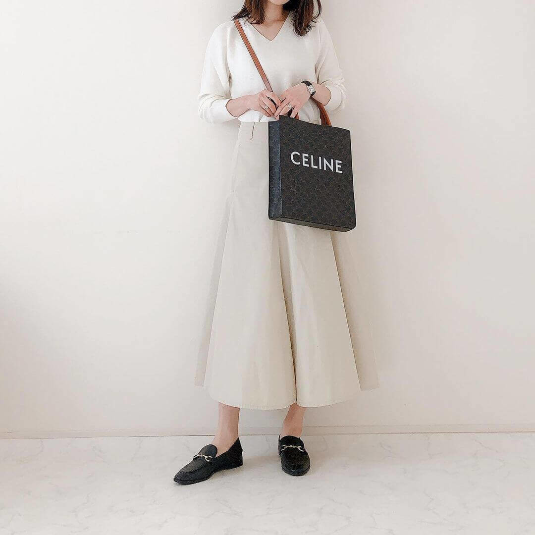 エクリュコーデに映える、ブランドバッグとトラッドなビットローファーを履いてメリハリのある装いに。
