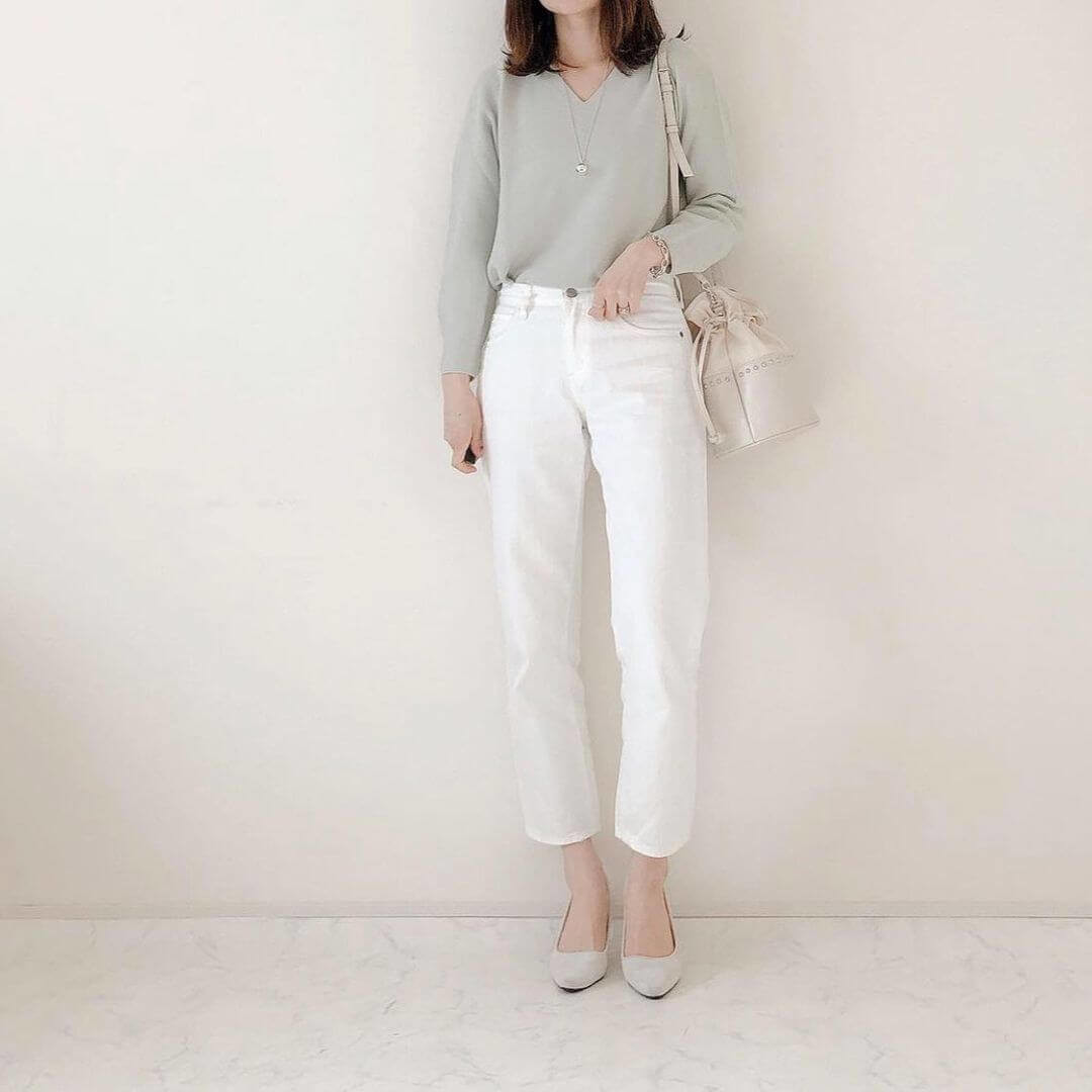 【3DVネックセーター】ホワイトデニムと合わせたクリーンコーデ