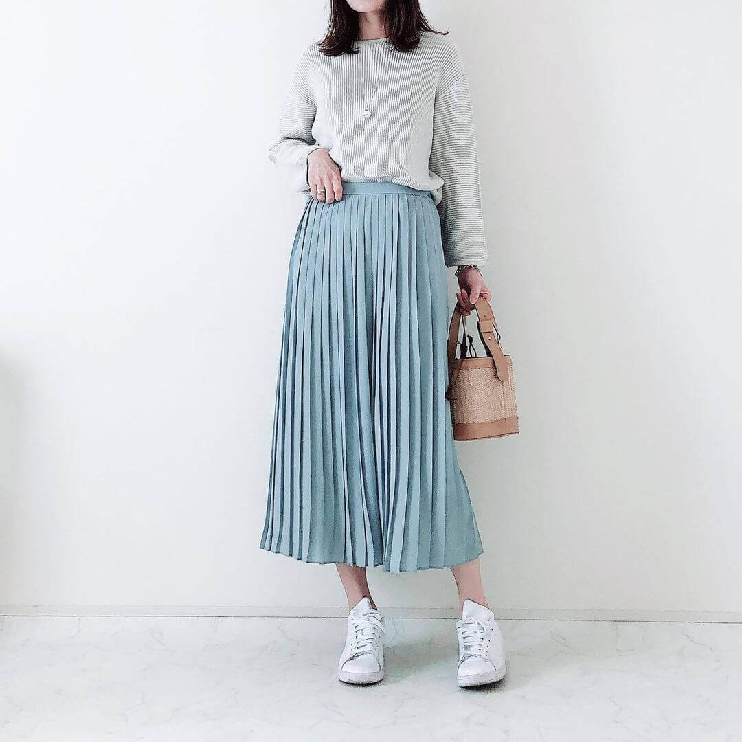ライトグレーのセーターにユニクロのブループリーツスカートをオン。