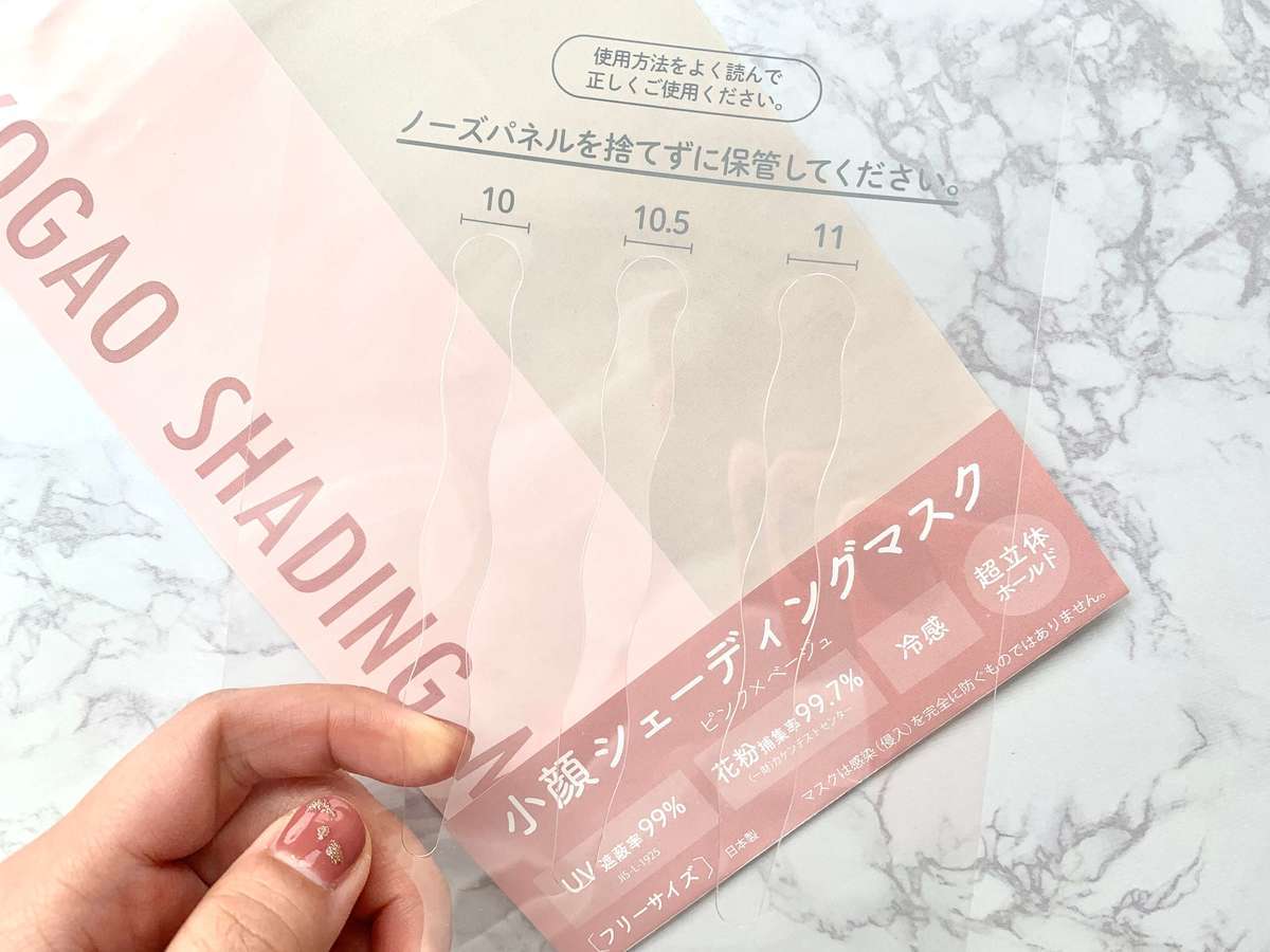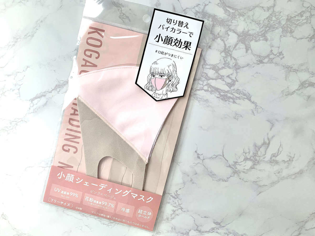 このマスク、顔の真正面部分は肌なじみのいい明るいピンクベージュ。フェイスラインから耳にかけてがグレージュになっていてシェーディング効果があり小顔効果が!