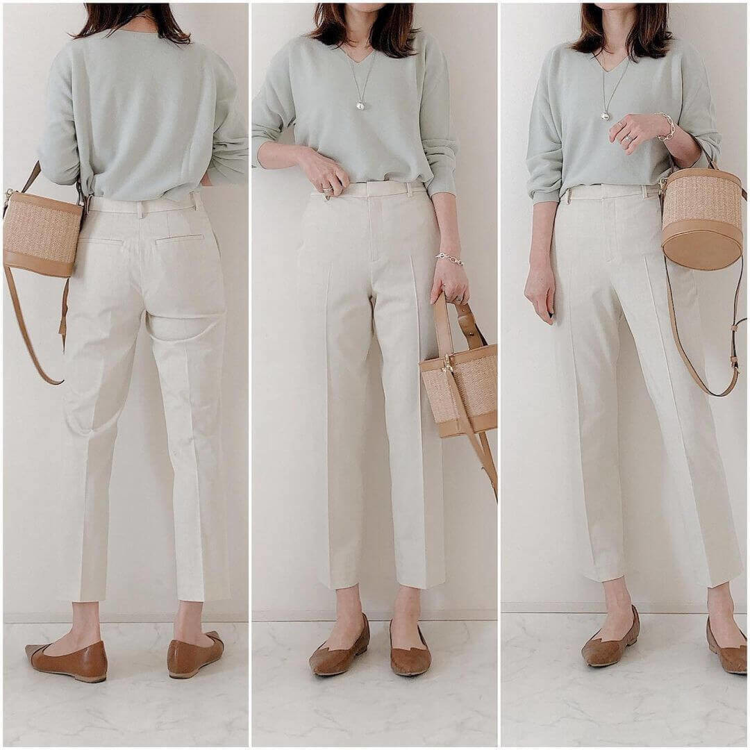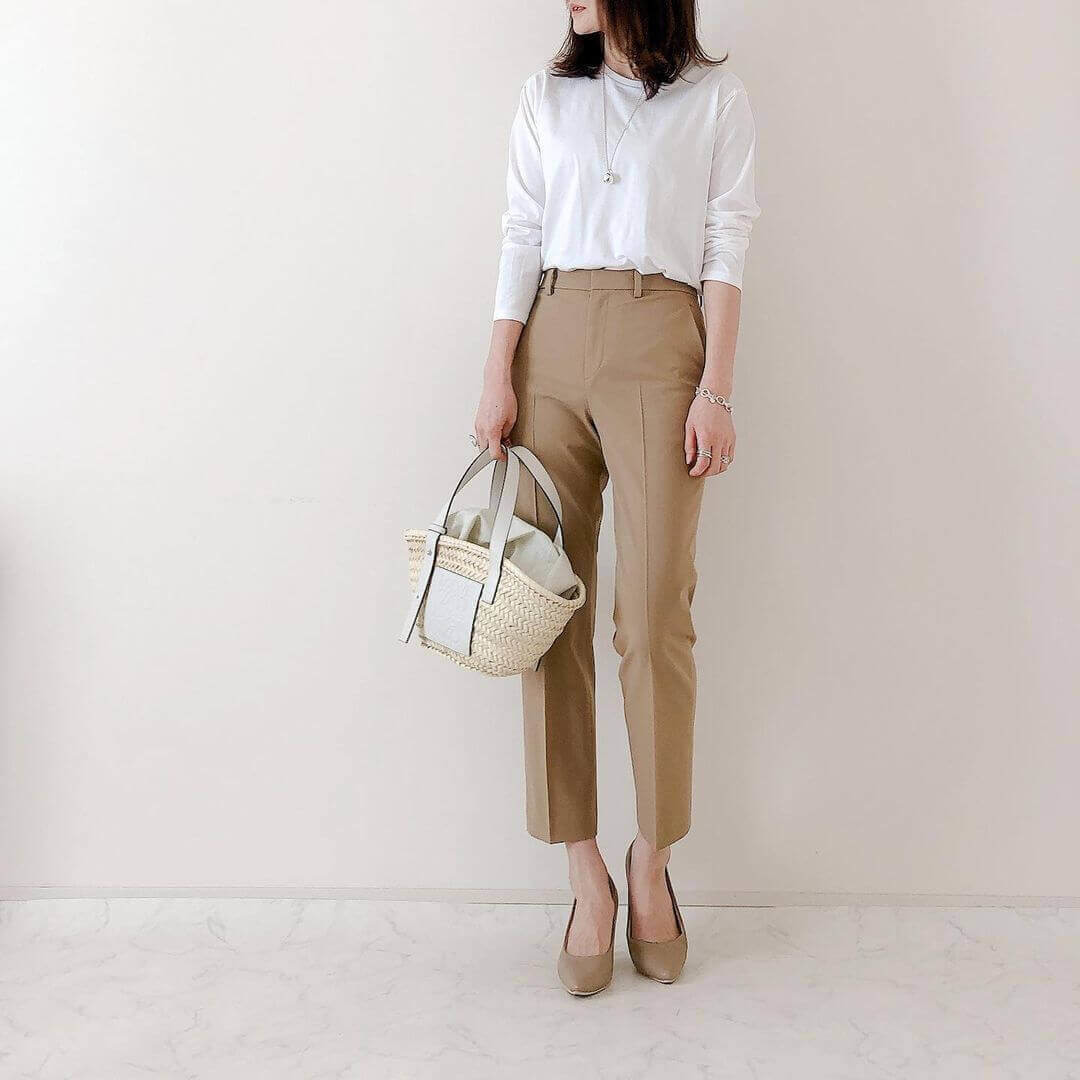 シーズンレスで使えるベージュパンツは、オフィスコーデにもあると重宝しますね。