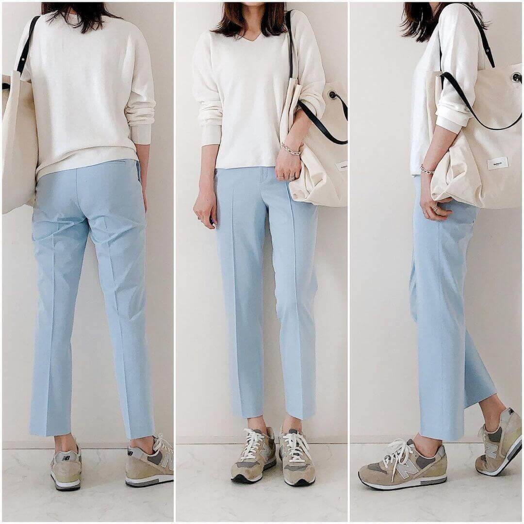 清らかな印象を与えてくれるブルーカラーのパンツ。ユニクロの白い3Dセーターとコーディネートして、クリーンなムードを引き出して。