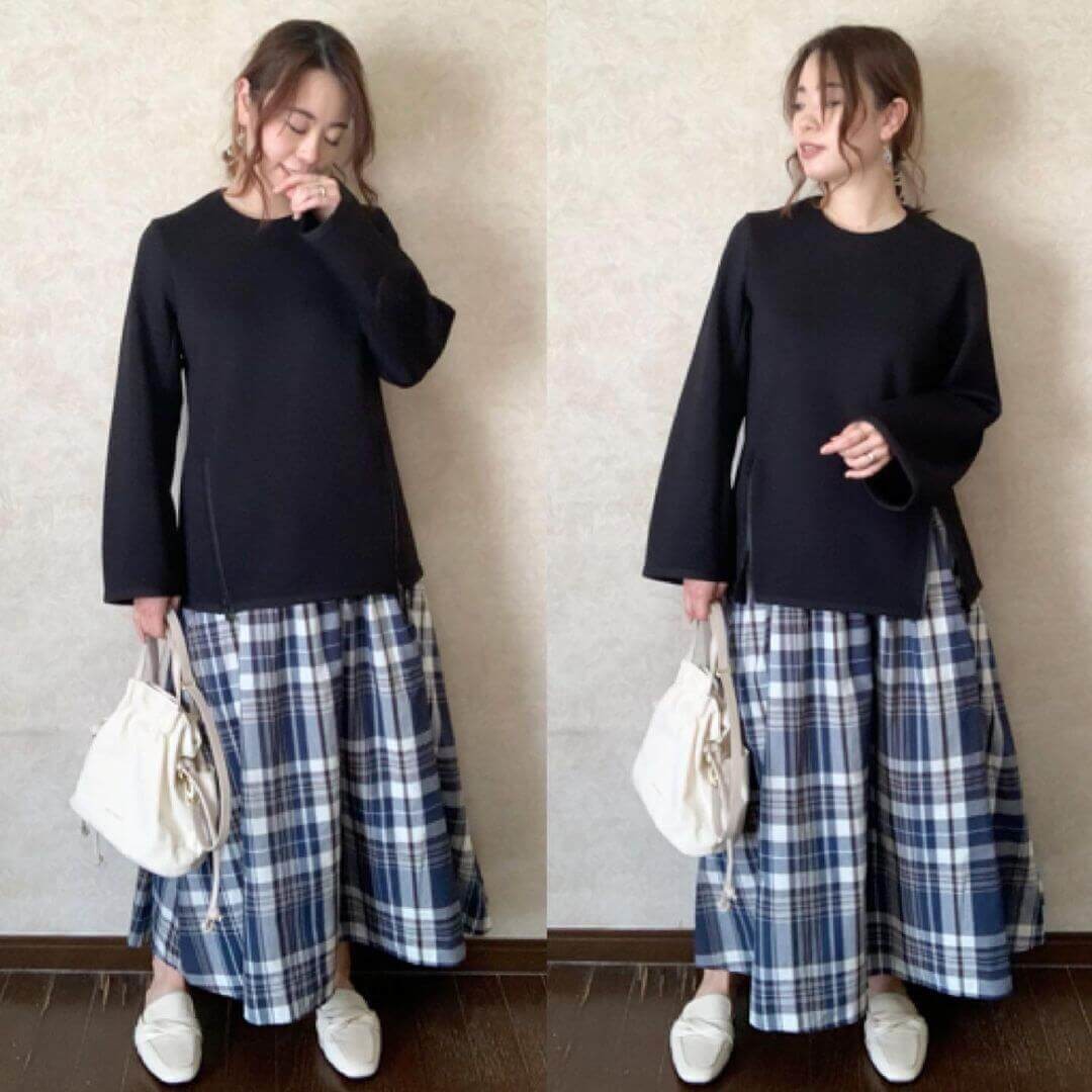 チェック柄のスカートとコーディネートして、クラシックな雰囲気を演出。