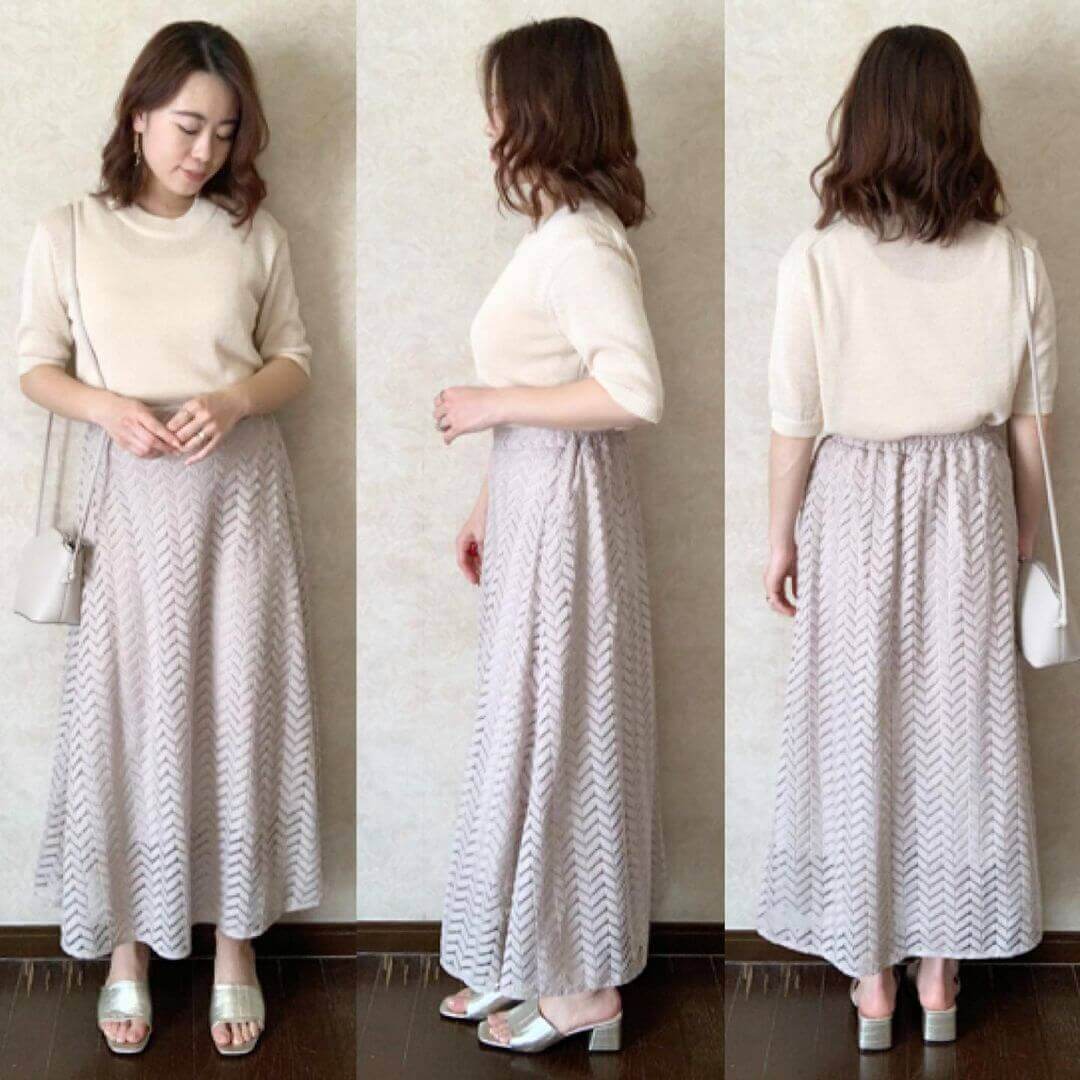 レーススカートにシアーニットを着こなした、清涼感のあるレディコーデ。