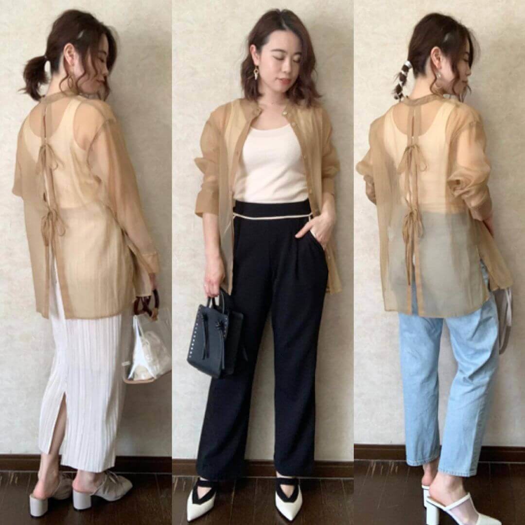 透け感を楽しむトップスなので、合わせるインナーとの組み合わせのアレンジが効きますね。