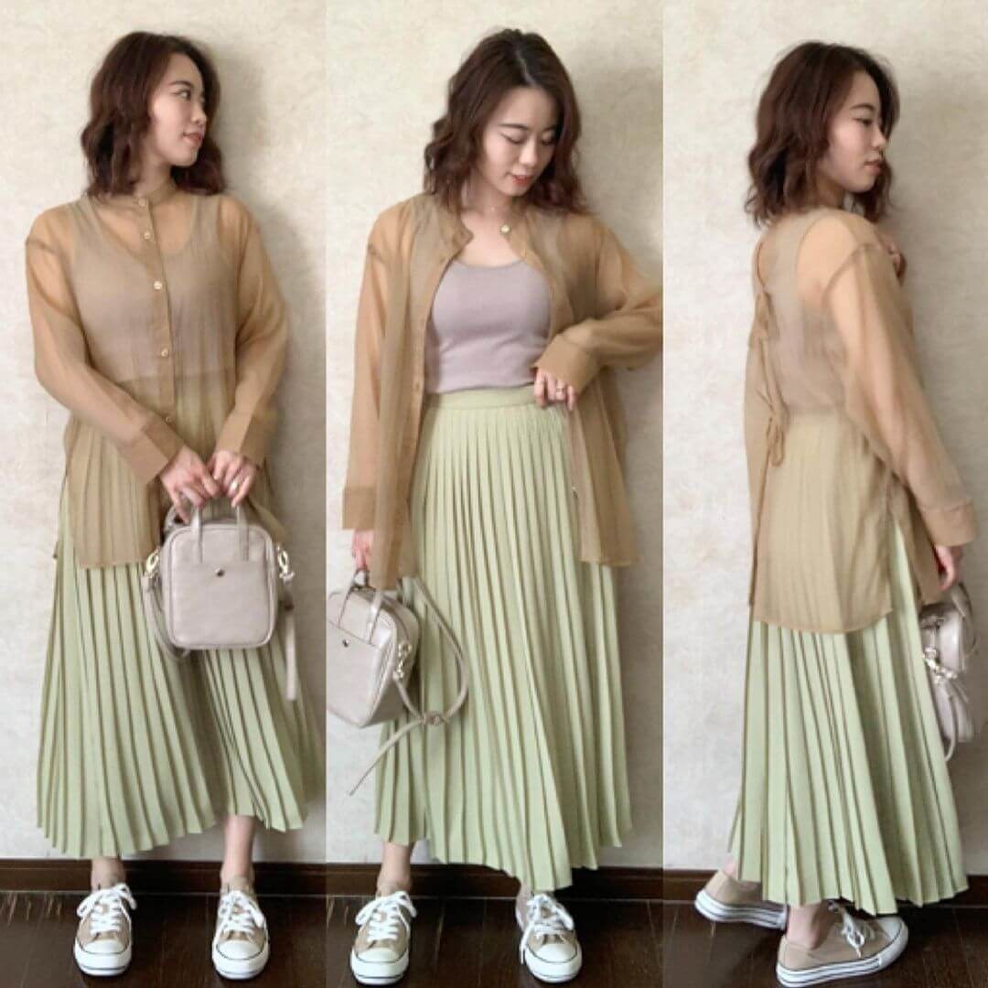 グリーンのプリーツスカートとコーディネートしたアースカラーの配色で、ナチュラルな雰囲気に。
