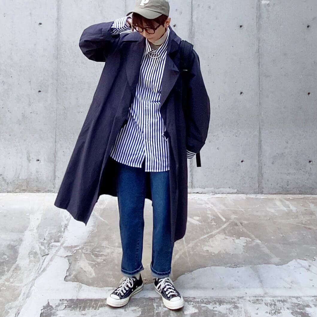 ストライプシャツをインにするときは、ベストやロゴスウェットを重ねたり、メインアイテムによって印象が激変します。