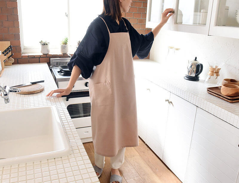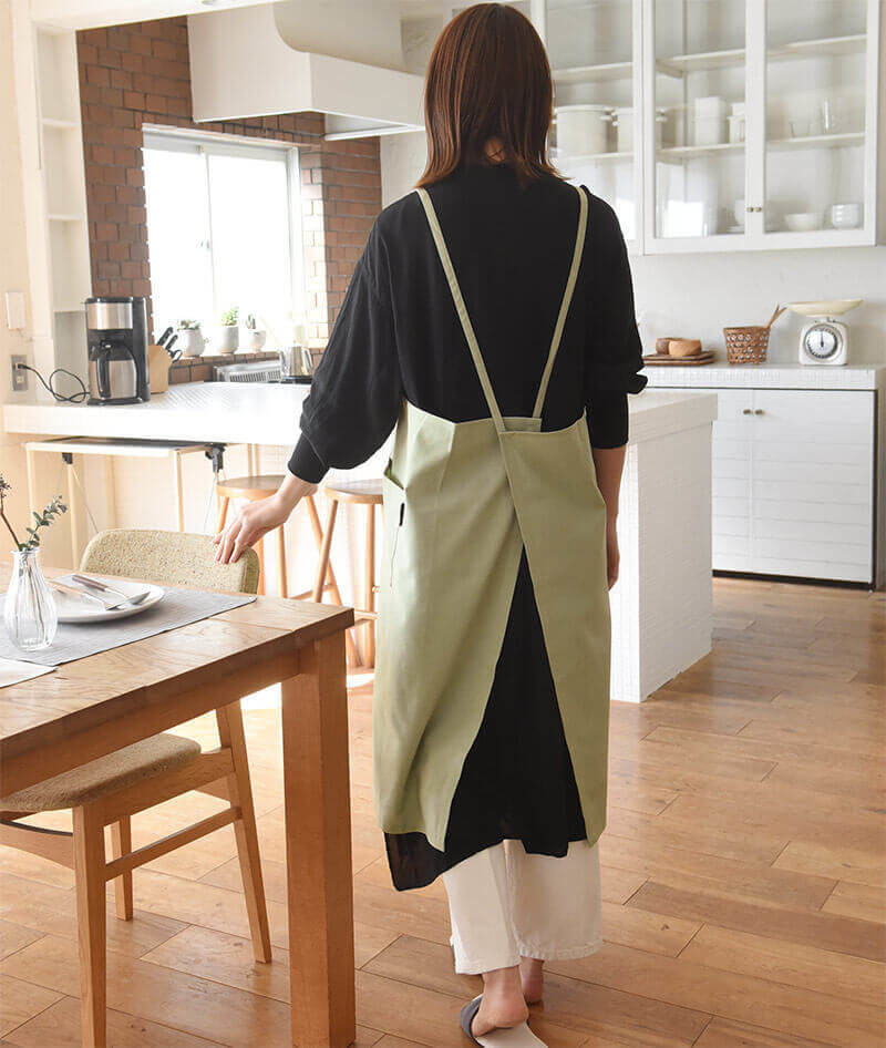 ホルタータイプのエプロンは肩がこりやすいですが、こちらは頭からスポッとかぶるだけ。リボンを結ぶ必要もないので、脱着が簡単。